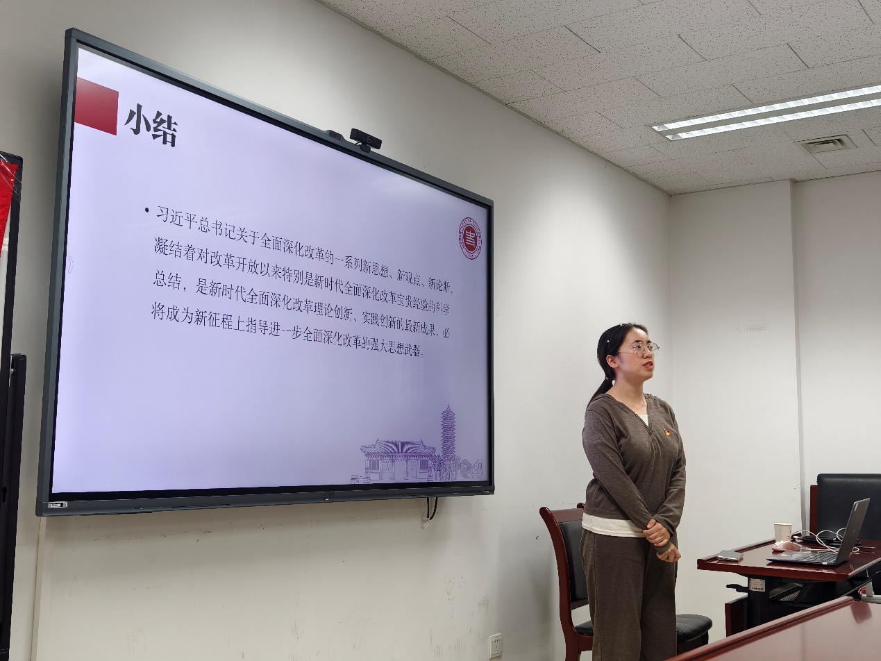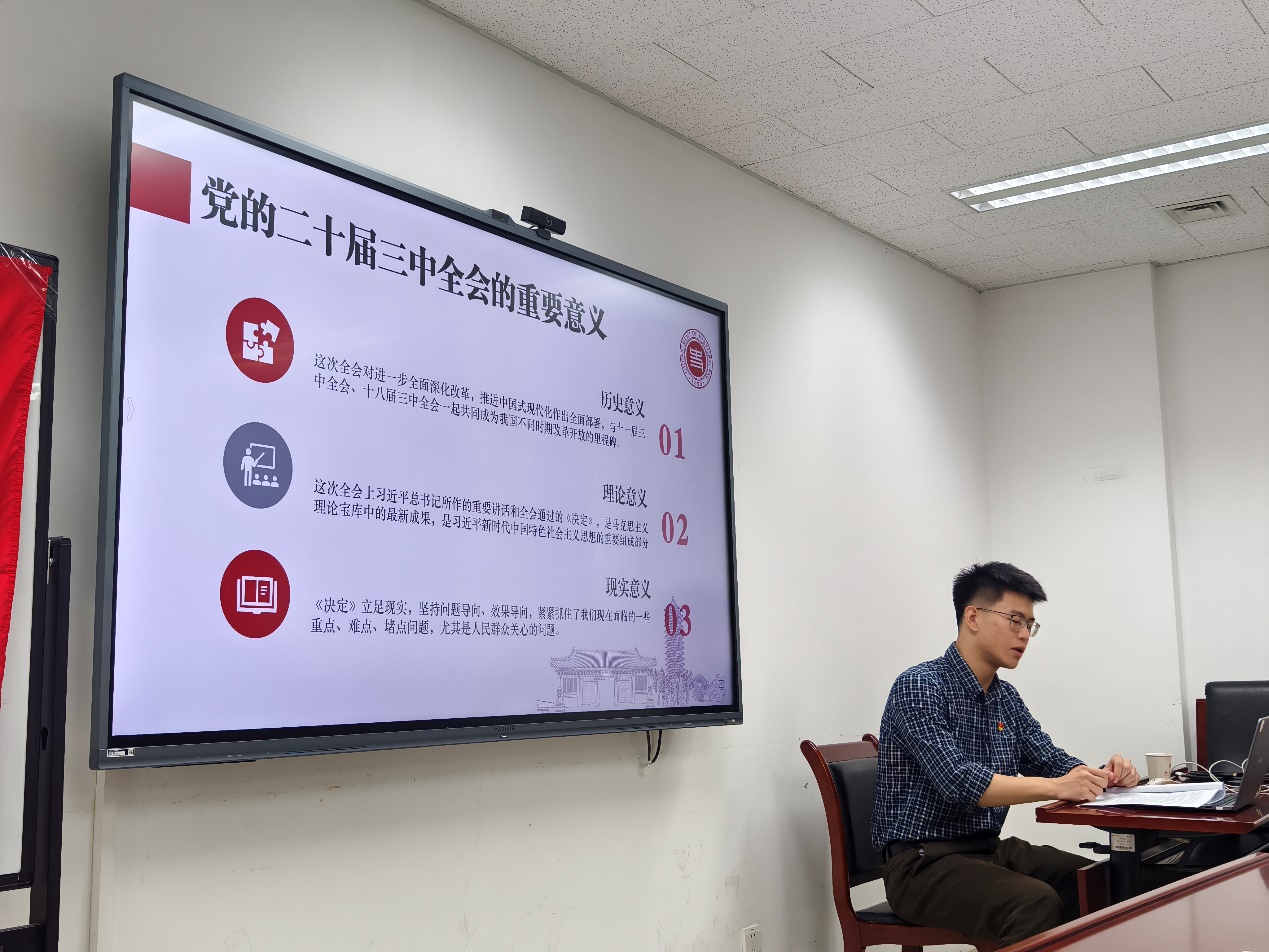 接着,新一届支部书记黎子承带领全体师生共学党的二十届三中全会精神。党的二十届三中全会于7月15日至18日在北京举行,是在以中国式现代化全面推进强国建设、民族复兴伟业的关键时期举行的一次会议,具有跨时代的重要意义。全会最重要的成果是审议通过《中共中央关于进一步全面深化改革、推进中国式现代化的决定》。黎子承详细介绍了《决定》产生的背景、主要内容及其重要意义。他在报告中指出,习近平总书记关于全面深化改革的一系列新思想、新观点、新论断,必将成为新征程上指导进一步全面深化改革的强大思想武器;他号召全体支部同志深入学习贯彻习近平总书记关于全面深化改革的重要论述,努力从专业角度为改革发展提供青春思路,贡献青春力量。